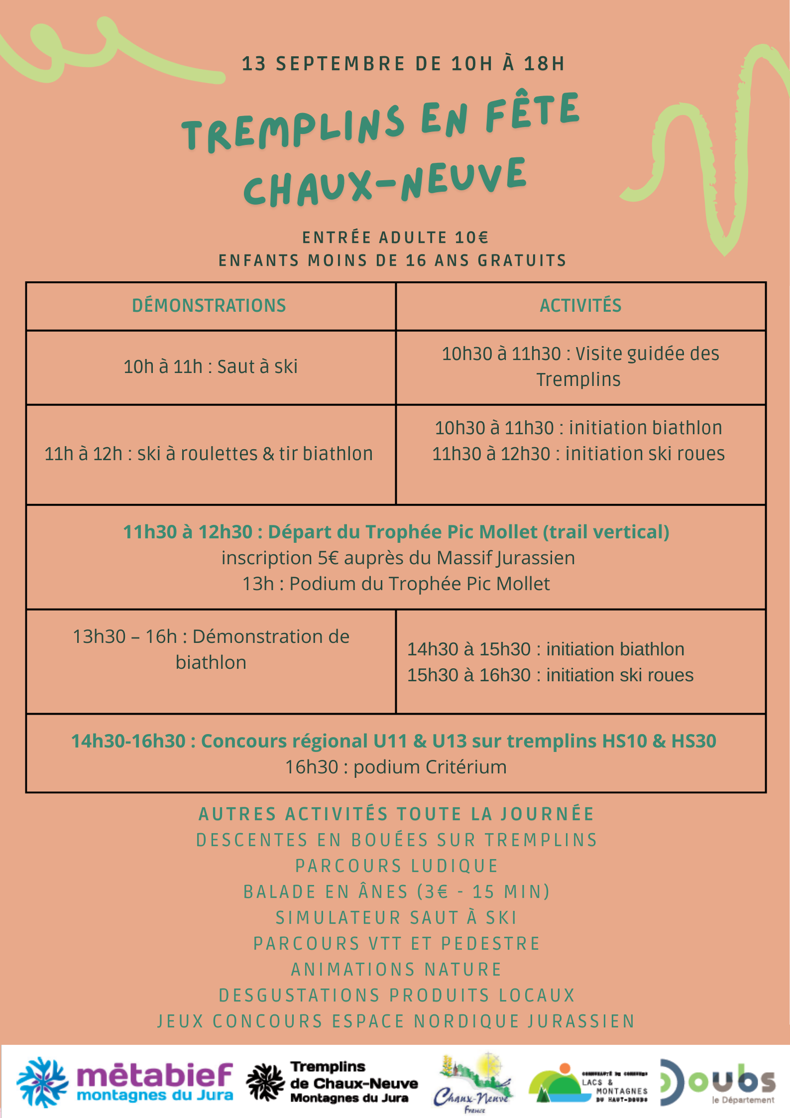 Le Syndicat Mixte du Mont d’Or, avec le soutien de la Commune de Chaux-Neuve, de la Communauté de Communes lacs et Montagnes du Haut-Doubs et du conseil départemental du Doubs, et la participation active des associations qui font vivre la culture nordique (le Comité Nordique du Massif Jurassien, la Fédération Française de Ski, Ski 25, le Risoux Ski Club, le Ski Club de Mouthe et l’ASNI), vous invite à venir découvrir le site avec "Tremplins en fête" !